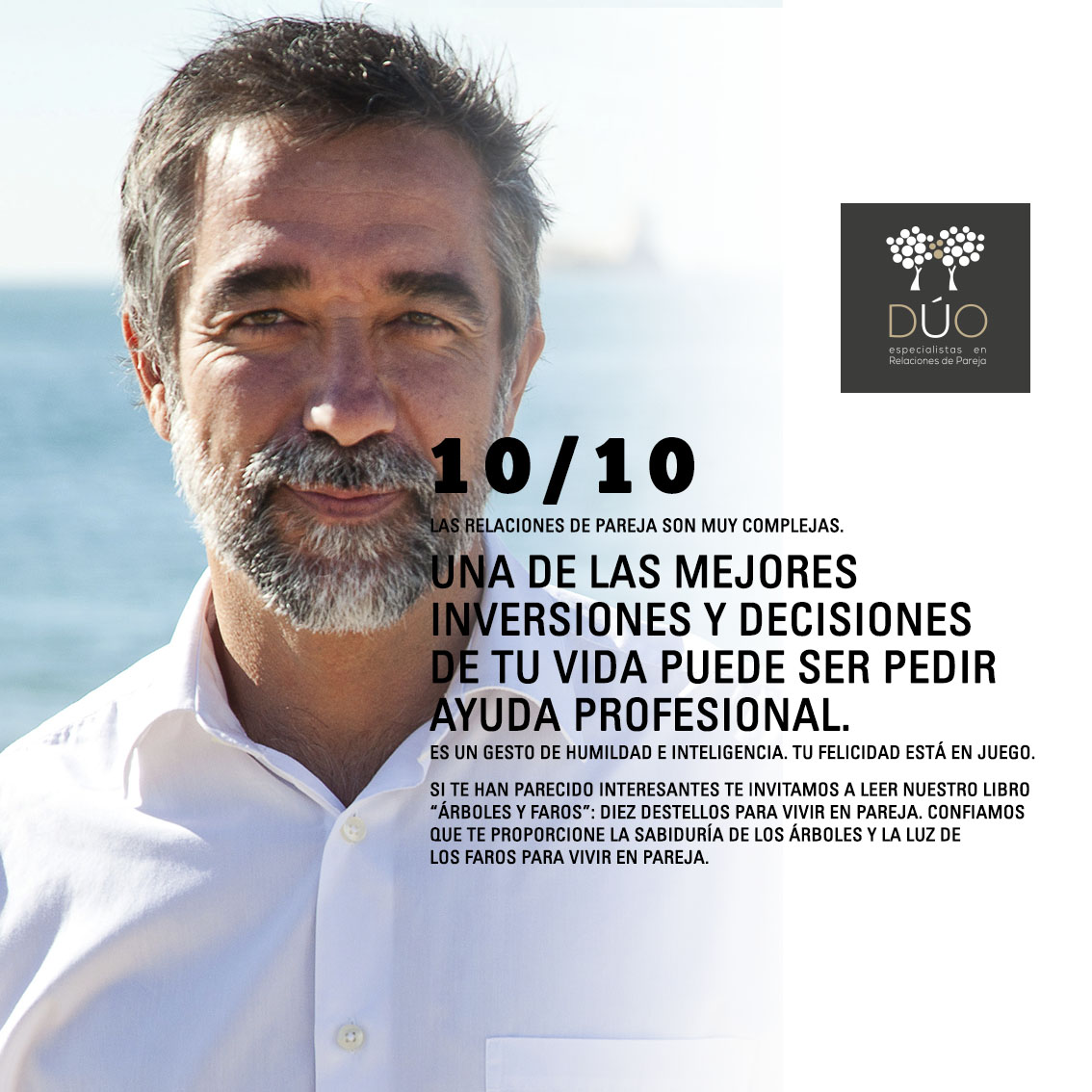10/10 Las relaciones de pareja son muy complejas. Una de las mejores inversiones y decisiones de tu vida puede ser pedir ayuda profesional. Es un gesto de humildad e inteligencia. Tu felicidad está en juego.