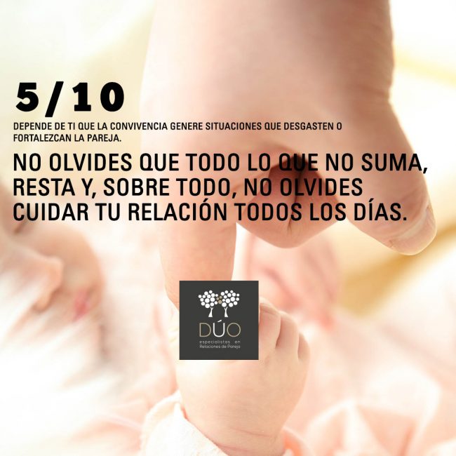 5/10 Depende de ti que la convivencia genere situaciones que desgasten o fortalezcan la pareja. No olvides que todo lo que no suma, resta y, sobre todo, no olvides cuidar tu relación todos los días.