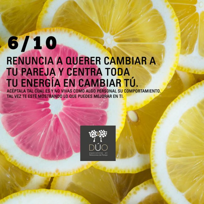 6/10 Renuncia a querer cambiar a tu pareja y centra toda tu energía en cambiar tú. Acéptala tal cual es y no vivas como algo personal su comportamiento. Tal vez te esté mostrando lo que puedes mejorar en ti.